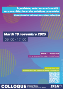 Ce colloque organisé par l’EPSM 71 propose une journée d’échanges, de réflexions et de partages d’expériences autour de la pratique du soin en addictologie. Professionnels de santé, chercheurs, magistrats notamment croiseront leurs regards pour questionner et enrichir nos pratiques quotidiennes.